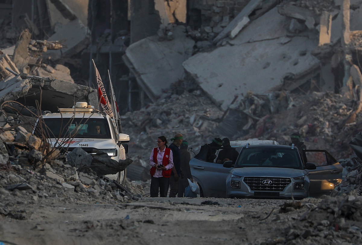 epa12505511 Fighters of the Al-Qassam Brigades, the military wing of the Hamas movement, stand guard as they search for the bodies of Israeli hostages alongside Red Cross workers in Al Shejaeiya neighbourhood in the east of the Gaza City, Gaza Strip, 05 November 2025. EPA/MOHAMMED SABER