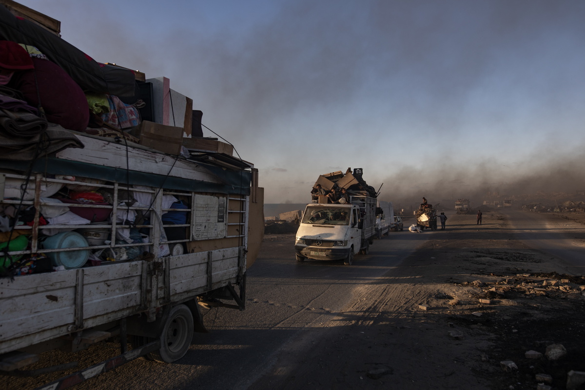 epa12344096 Displaced Palestinians from the northern Gaza Strip flee with their belongings along Al-Rasheed Street, west of Gaza City, 01 September 2025. According to the UN around 90 percent of the population or 1.9 million people in Gaza have been displaced since the start of the conflict. EPA/HAITHAM IMAD