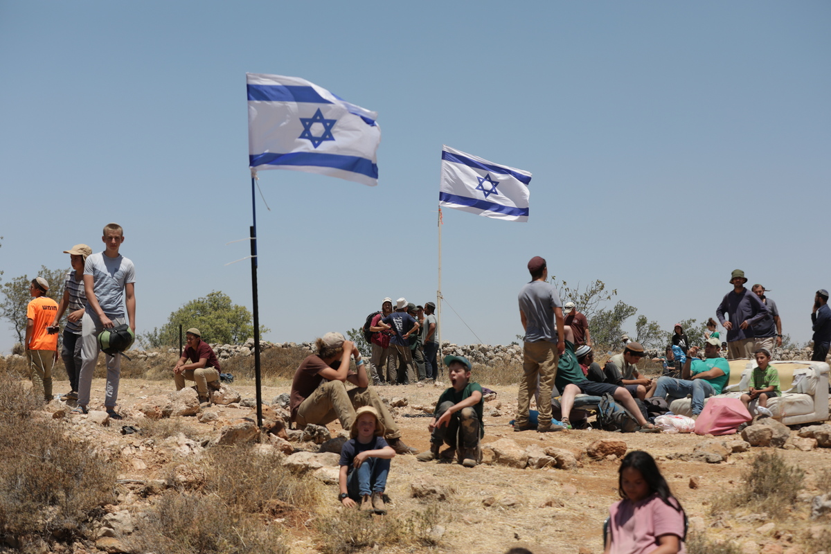 epa10084066 Israeli settlers occupy in an illegal outpost near the Israeli settlement of Kiryat Arba near the Palestinian city of Hebron in the West Bank, 21 July 2022 . Several hundred Israeli settlers spend a night on a hill near the city of Hebron on July 20, in order to encourage the Israeli government to build more settlements in the West Bank. On 21 July Israeli Border Police removed the settlers. EPA/ABIR SULTAN