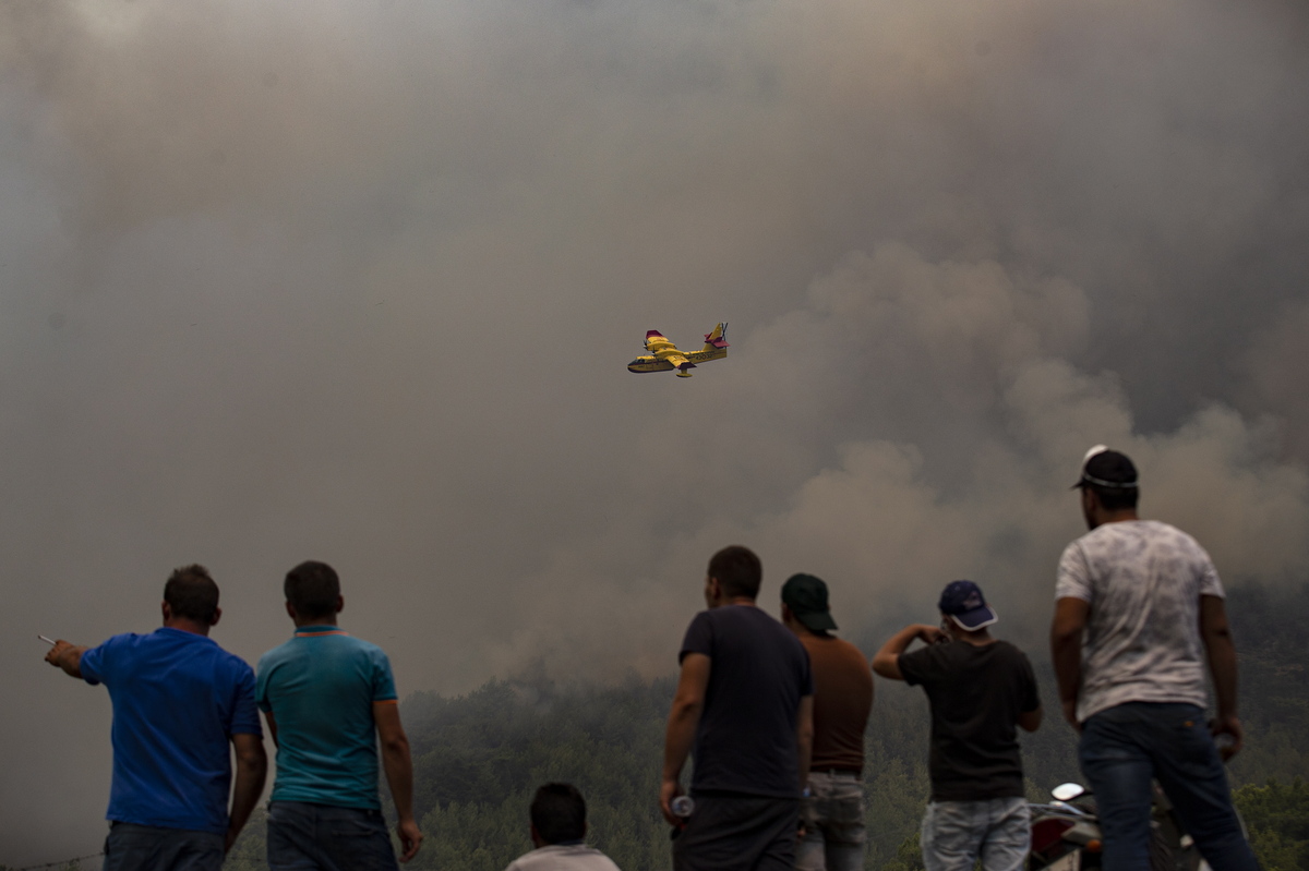 epa09394753 Spanish hydroplanes waterbombs a wildfire burning as people watch near the Yuvarlakcay village of Koycegiz district of Mugla, Turkey, 04 August 2021. Turkish Health minister Fahrettin Koca confirmed that eight people have lost their lives due to the wildfires raging in Turkey’s Mediterranean towns. EPA/ERDEM SAHIN