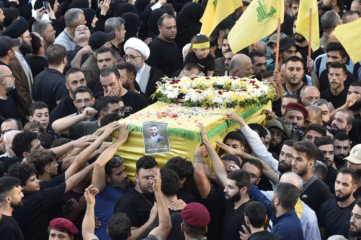 epaselect epa11612073 Mourners carry the coffin of one of the people who died a day earlier in pagers blasts, during the funeral procession in the southern suburb of Beirut, Lebanon, 18 September 2024. Health Minister of Lebanon Firas Abiad said at least 12 people died and more than 2800 others injured after multiple wireless communication devices (pagers) were detonated on 17 September. Hezbollah declared in a statement that Israel was behind the strike and that there will be consequences. EPA/WAEL HAMZEH