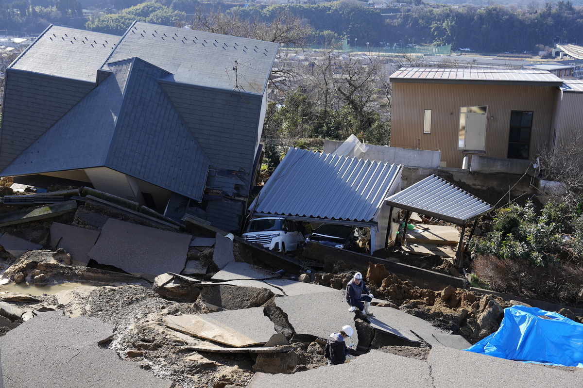 epa11052847 A view of a damaged road following a strong earthquake in Kanazawa, Ishikawa Prefecture, Japan, 02 January 2024. At least six people have died after a strong earthquake hit a wide area on the Sea of Japan coast on 01 January, according to the National Police Agency. The earthquake recorded a maximum intensity of 7 on the Japanese seismic scale in the Noto Peninsula and triggered a major tsunami warning in Ishikawa Prefecture. EPA/FRANCK ROBICHON