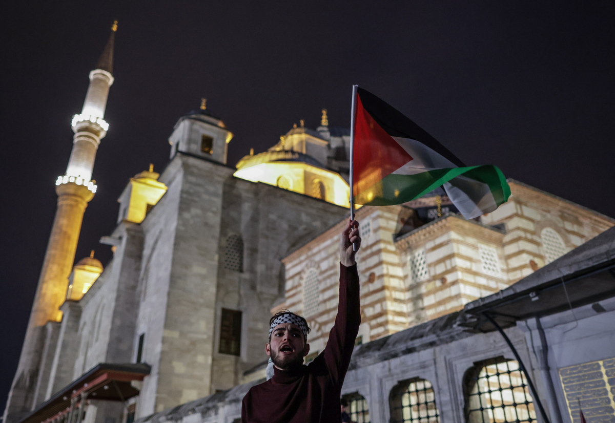 epa10560696 A man holds Palestine flag and shout slogans during a protest against Israel after a Tarawih prayer at the Fatih Mosque in Istanbul, Turkey, 05 April 2023. Israeli police stormed the al-Aqsa mosque in Jerusalem during Ramadan prayers early 05 April arresting hundreds of Palestinians. EPA/ERDEM SAHIN