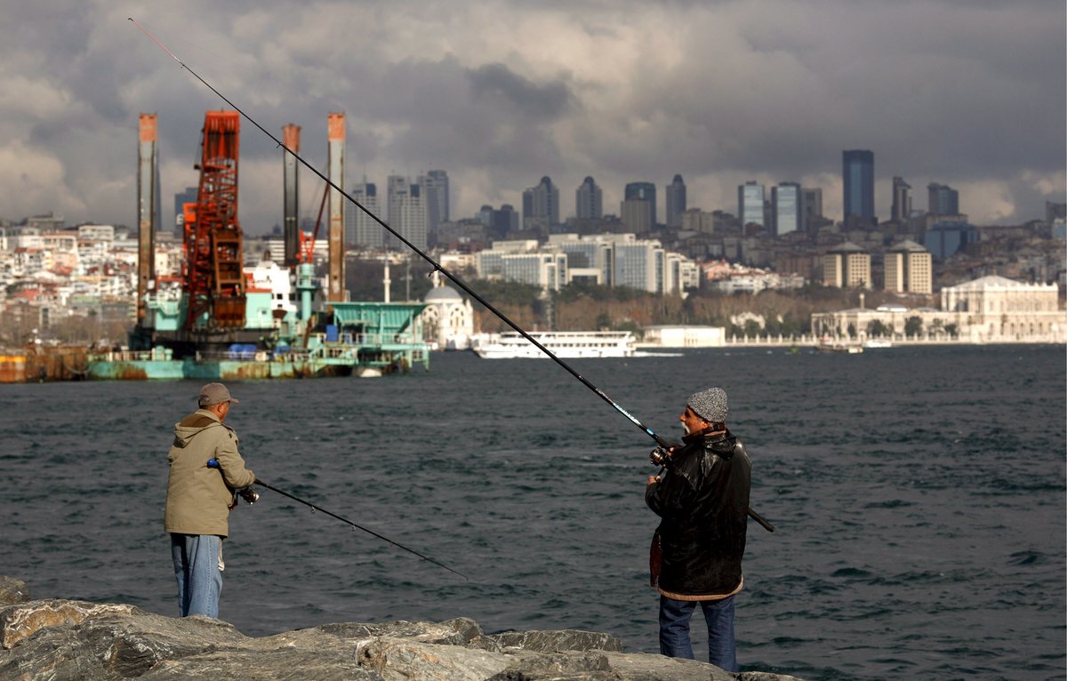 epa01578605 Fishermen are angling while heavy machine works on the Bosphorus for the first underwater tunnel of Turkey with an overview of modern Istanbul silhouette in Istanbul, Turkey on 15 December 2008. The world's narrowest strait used for international navigation it connects the Black Sea with the Sea of Marmara . The first underwater tunnel of Turkey is still in process under Bosphorus. EPA/KERIM OKTEN