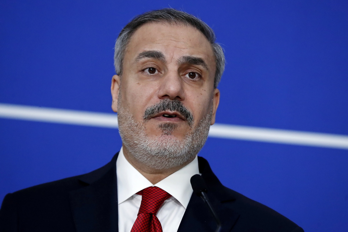 epa11115730 Turkish Foreign Minister Hakan Fidan attends a joint press conference with his Romanian counterpart following their meeting held at the Romanian Foreign Ministry headquarters in Bucharest, Romania, 31 January 2024. EPA/ROBERT GHEMENT