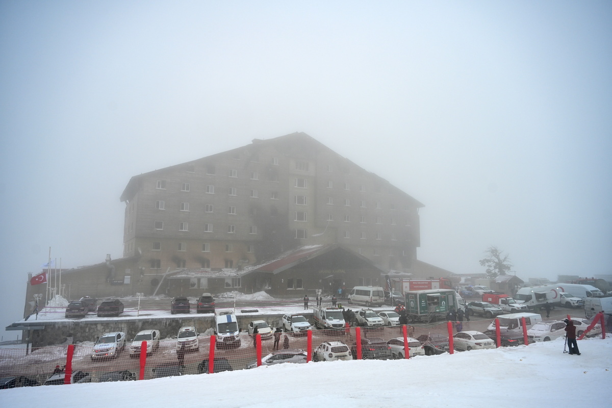 epaselect epa11844018 Search and rescue teams' vehicles are parked in front of the hotel that caught fire, in the Kartalkaya Ski Resort in Bolu, Turkey, 22 January 2025. According to the Turkish Interior Minister Ali Yerlikaya, at least 76 people died and 51 others were injured in the fire that broke out on 21 January. The Turkish president declared 22 January as a national day of mourning for the victims of the fire. EPA/STR