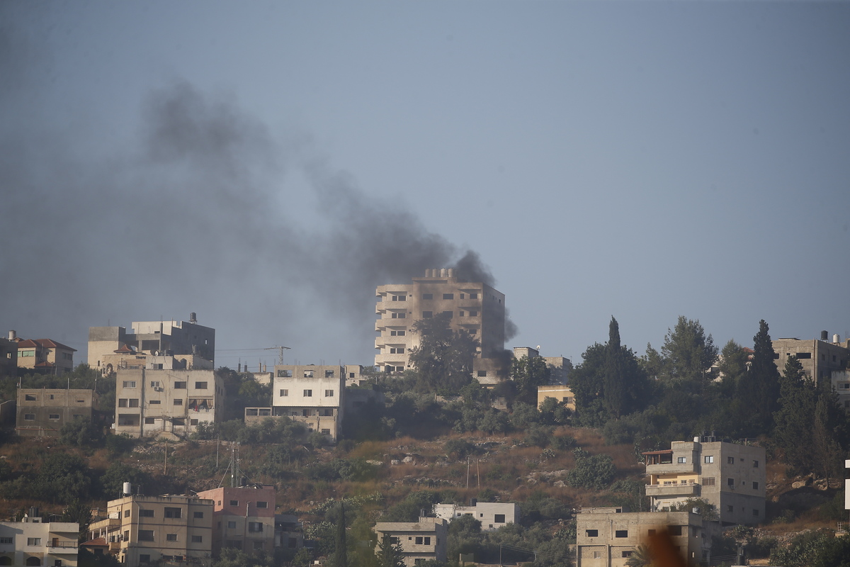 epa10723219 Smoke rises as the Israeli military conducts air raids in Jenin, the West Bank, 03 July 2023. The Israel Defense Forces announced on 03 July that they launched a large-scale operation in Jenin. According to the Palestinian Health Ministry, at least three people were killed and 25 were wounded in Israeli military air attacks in Jenin. EPA/ALAA BADARNEH