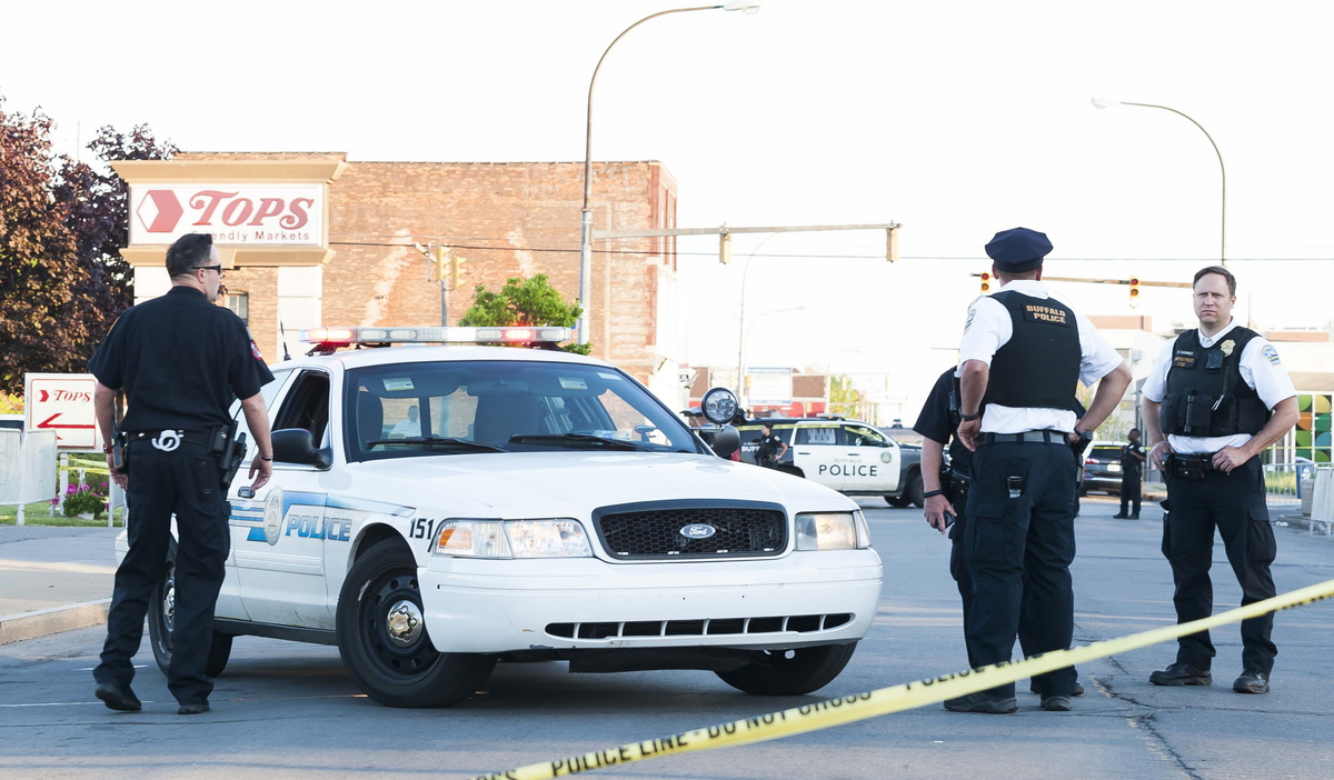 epa09950091 Police secure the site of yesterday's shooting at a Tops Friendly Market grocery store in Buffalo, New York, USA, 15 May 2022. A gunman, who has been identified by authorities as 18-year-old Payton S. Gendron and is in police custody, reportedly opened fire at the market on Saturday afternoon and killed 10 people. EPA/BRANDON WATSON