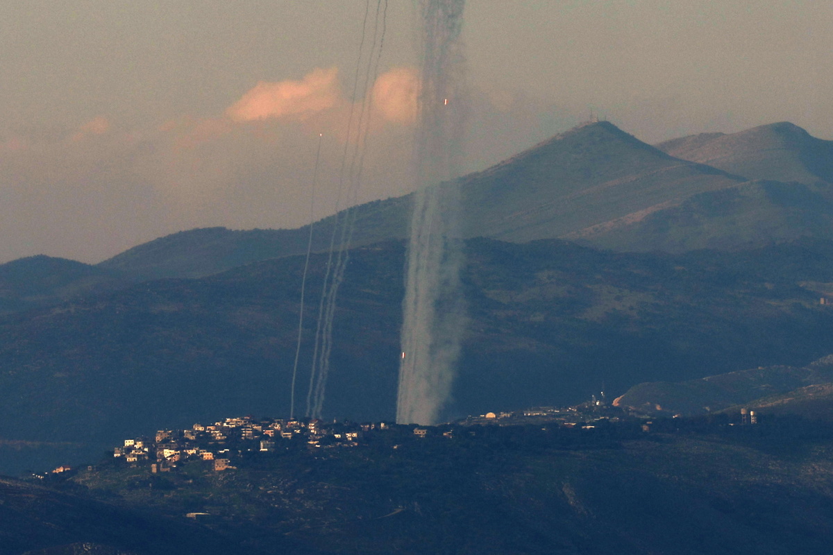 epa11183273 Missiles are launched from southern Lebanon towards northern Israel, as seen from the Israeli side of the border, 26 February 2024. The Israeli army reports that it is currently striking Hezbollah targets deep inside Lebanon. EPA/ATEF SAFADI