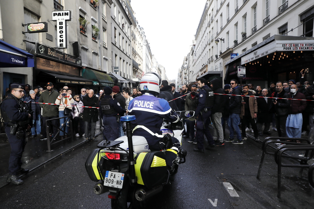epa10377112 Local residents and onlookers gather following a shooting incident on 'Rue d'Enghien', near a Kurdish cultural centre in Paris, France, 23 December 2022. The Paris Police Prefecture announced on its social media that a suspect was detained in connection to the incident. EPA/TERESA SUAREZ