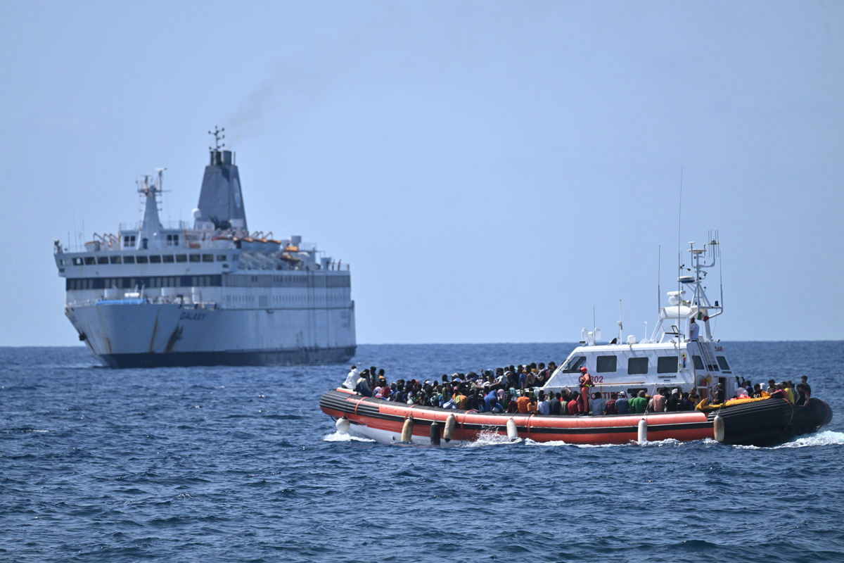 epa10861733 Some migrants are taken in dinghy to board the 'Galaxy' ferry which will head towards Porto Empedocle, Lampedusa, southern Italy, 15 September 2023. A record number of migrants and refugees have arrived on the Italian island of Lampedusa in recent days. Lampedusa's city council declared a state of emergency on 13 September evening after a 48-hour continuous influx of migrants. In the morning of September 14, nearly 7,000 migrants were on the island. EPA/CIRO FUSCO