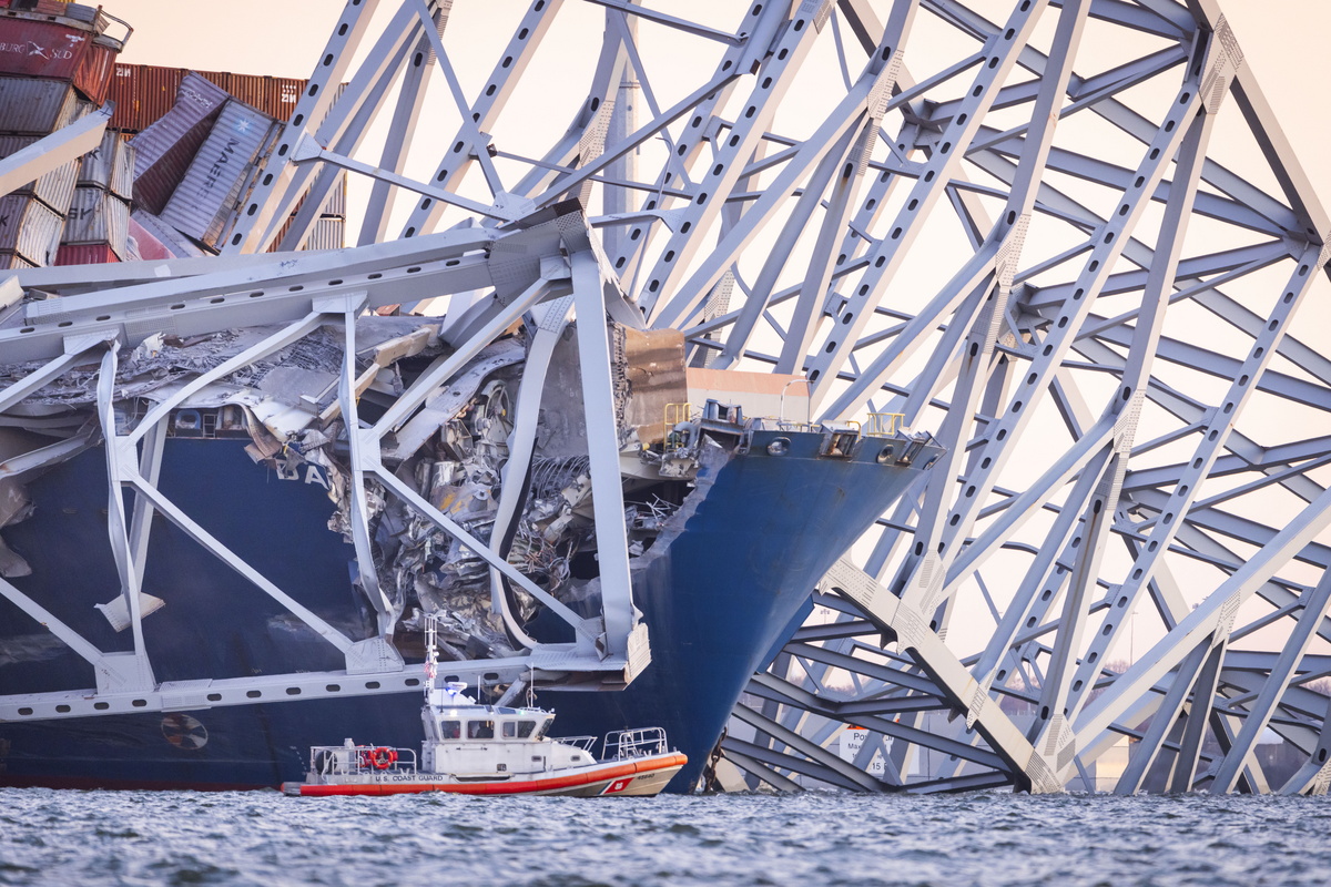 epa11244310 The Francis Scott Key Bridge rests partially collapsed after a cargo ship ran into it in Baltimore, Maryland, USA, 26 March 2024. The Maryland Department of Transportation confirmed that the Francis Scott Key Bridge collapsed due to a ship strike on 26 March. According to Baltimore City Fire Department Chief James W. Wallace, a search operation was underway to locate at least seven people believed to be in the waters of the Patapsco River following the incident. 'Sonar has detected the presence of vehicles submerged in the water', Wallace added. The Singapore-flagged cargo ship DALI was traveling from Baltimore to Colombo, Sri Lanka, MarineTraffic confirmed. EPA/JIM LO SCALZO