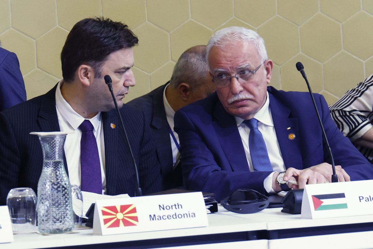 epa10997335 Palestinian National Authority Foreign Minister Riyad al Maliki (R) chats with with North Macedonia's Foreign Minister Bukhar Osmani (L) during the 8th Regional Forum of the Union for the Mediterranean meeting held in Barcelona, eastern Spain, 27 November 2023. The two-days forum had started on 26 November and ends on 27 November. EPA/Quique Garcia / POOL