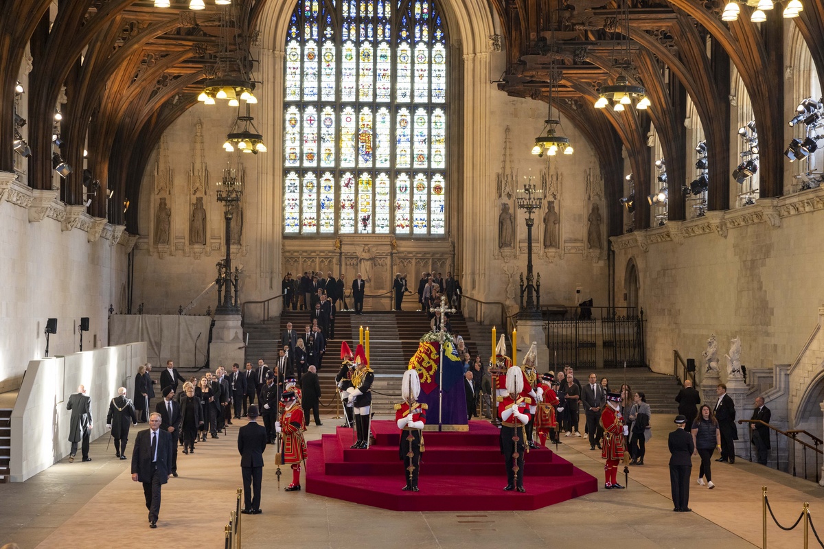 epa10184705 A handout photograph released by the UK Parliament shows the first members of the public attending the Lying-in-State of Britain's Queen Elizabeth II at the Palace of Westminster in London, Britain, 14 September 2022. The queen's lying in state will last for four days, ending on the morning of the state funeral on the 19 September. EPA/UK PARLIAMENT/ROGER HARRIS HANDOUT -- MANDATORY CREDIT: UK PARLIAMENT/ROGER HARRIS -- HANDOUT EDITORIAL USE ONLY/NO SALES
