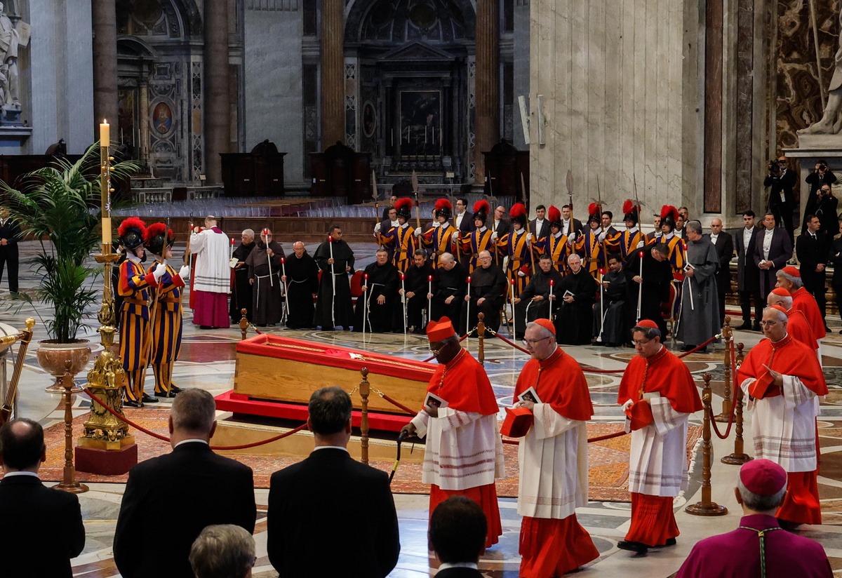 epa12048379 The body of Pope Francis lies in state at St. Peters Basilica, in Vatican City, 23 April 2025. Faithful and well-wishers will be able to pay their respects to the spiritual leader, who died on 21 April 2025, aged 88, until his funeral on 26 April. EPA/GIUSEPPE LAMI