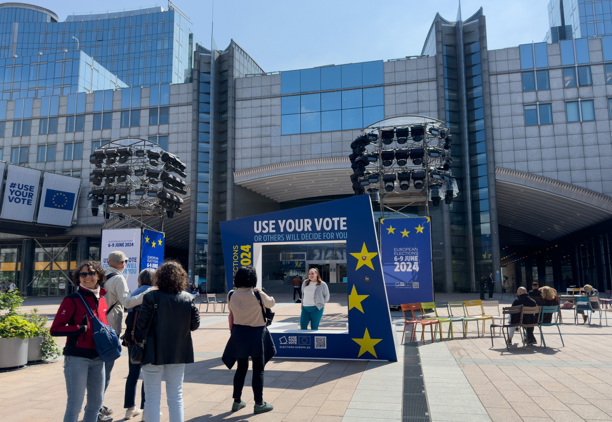 epa11395072 Placards are set up in front European Parliament from where the broadcast of the results of the European Elections will be aired on Sunday, 09 June at 18h CET, in Brussels, Belgium, 07 June 2024. European Parliament elections will be held in the European Union's 27 member countries from 06 to 09 June 2024 with around 360 million Europeans eligible to vote, the European Union says on its website. The EU Parliament is directly elected every five years by the citizens of the European Union. EPA/OLIVIER HOSLET