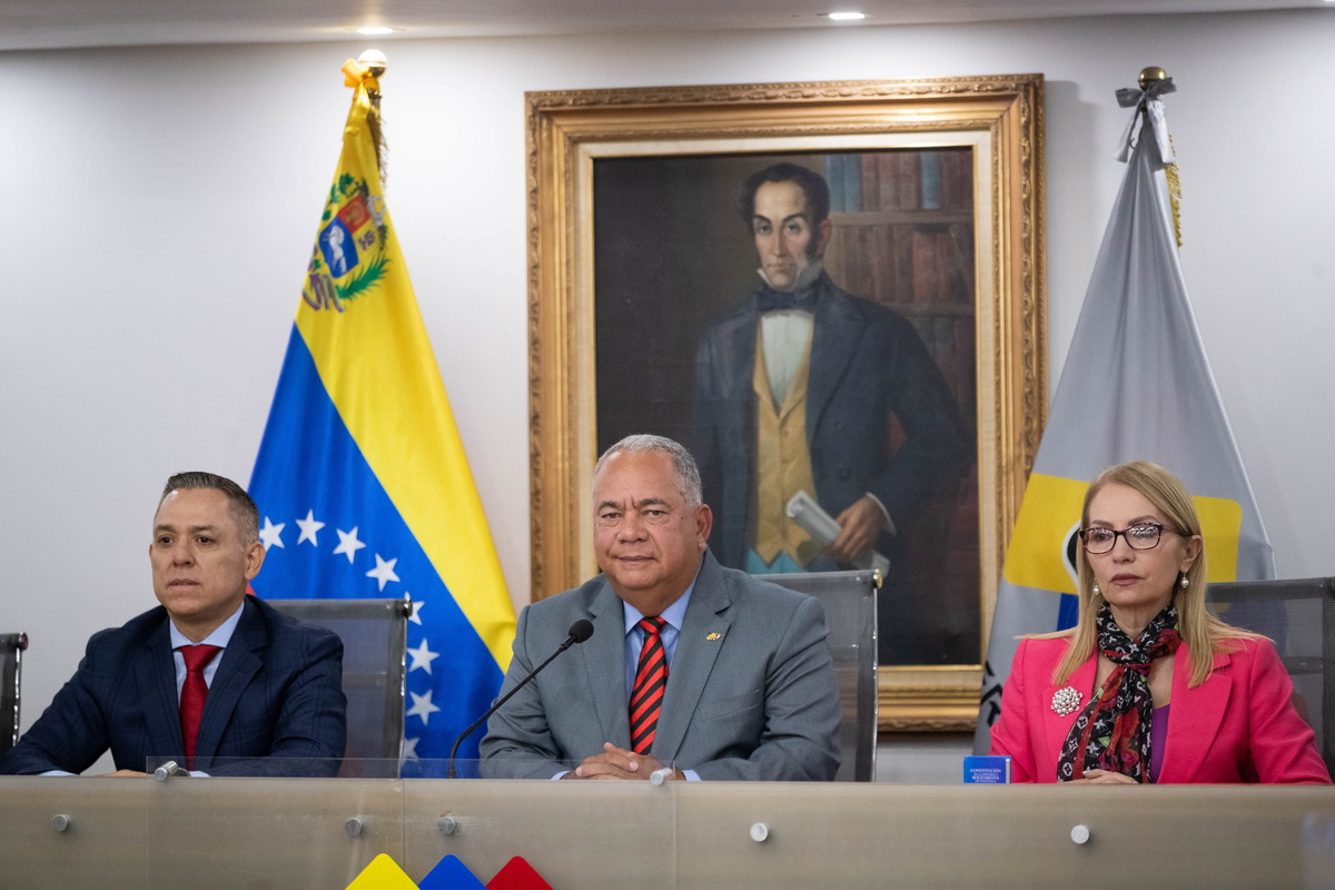 epa11200999 The president of the National Electoral Council (CNE), Elvis Amoroso (C), accompanied by the rectors Carlos Quintero (L) and Rosalba Gil Pacheco hold a press conference in Caracas, Venezuela, 05 March 2024. Venezuela will hold the presidential elections on 28 July 2024, announced the CNE, which also provided the most notable dates of the schedule that will run until the elections are held. According to Amoroso, the schedule states that candidate applications will be received from March 21 to 25 and the electoral campaign, which, on this occasion, will last 21 days, will take place between July 4 and 25. EPA/Rayner Peña R.