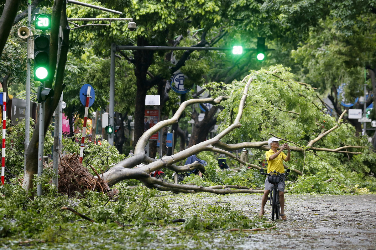 epaselect epa11592692 A cyclist records with a phone fallen trees after typhoon Yagi's landfall in Hanoi, Vietnam, 08 September 2024. Typhoon Yagi, Asia's most powerful storm so far this year, made landfall in northern Vietnam on 07 September, killing four people and injuring 78 others, according to state media. EPA/LUONG THAI LINH