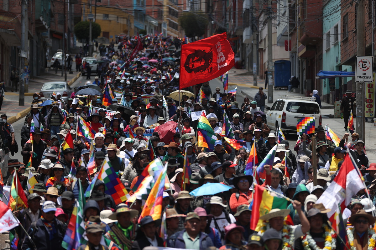 epa11822564 Supporters of former president Evo Morales (2006-2019) march against the judicial proceedings against the former president, in La Paz, Bolivia, 13 January 2025. Bolivia's Minister of Government (Interior), Eduardo del Castillo, accused Morales' supporters who marched from the Altiplano to La Paz of wanting to cause 'upheaval' in that city, seat of government, and warned that the police will protect its inhabitants. EPA/Luis Gandarillas