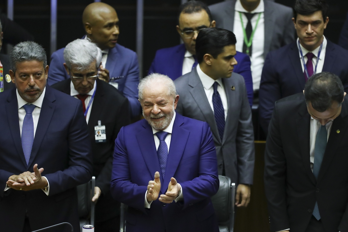 epa10385744 Brazil's President Luiz Inacio Lula da Silva (C, bottom) reacts during his inauguration ceremony at Parliament in Brasilia, Brazil, 01 January 2023. Lula was sworn in for his third term as President of Brazil after winning the October 2022 general elections. EPA/Jarbas Oliveria