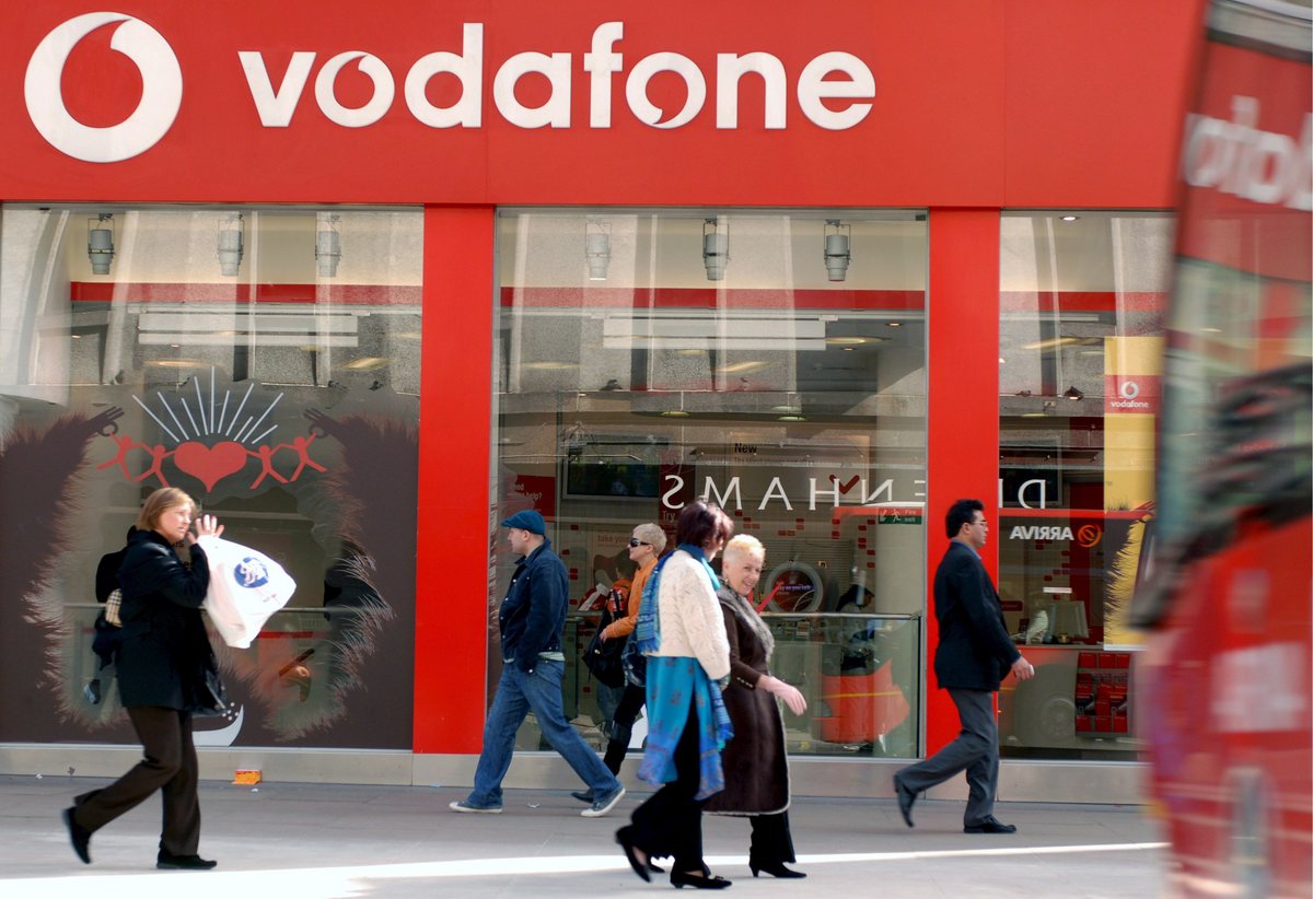 epa00975935 Pedestrians walk past a Vodafone store in central London, Wednesday 04 April 2007. Vodafone Group Plc, the world's largest mobile-phone company, agreed to sponsor the UEFA Cup Finals and the UEFA Super Cup soccer matches for three years to promote its products and services. The deal, which will run until June 2009, will cover three UEFA Cup Finals and two UEFA Super Cups, the Newbury, England- based company said today in a Regulatory News Service statement. Financial details of the arrangement were not disclosed. EPA/ANDY RAIN