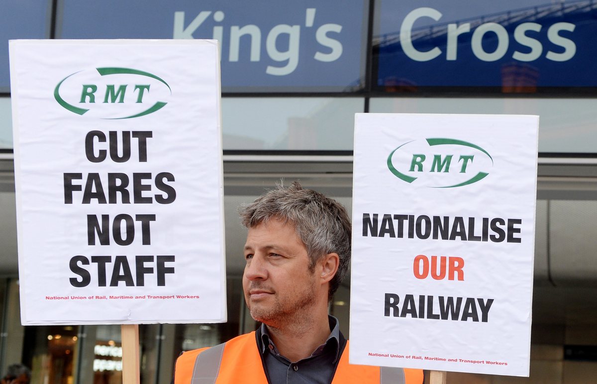 epa03822896 Protesters demonstrate outside Kings Cross railway station in London, Britain 13 August. Unions protested at stations around the UK calling for the railways to be returned to public ownership. Commuters in England are to face an average 4.1 percent rise in rail fares from January 2014. EPA/ANDY RAIN