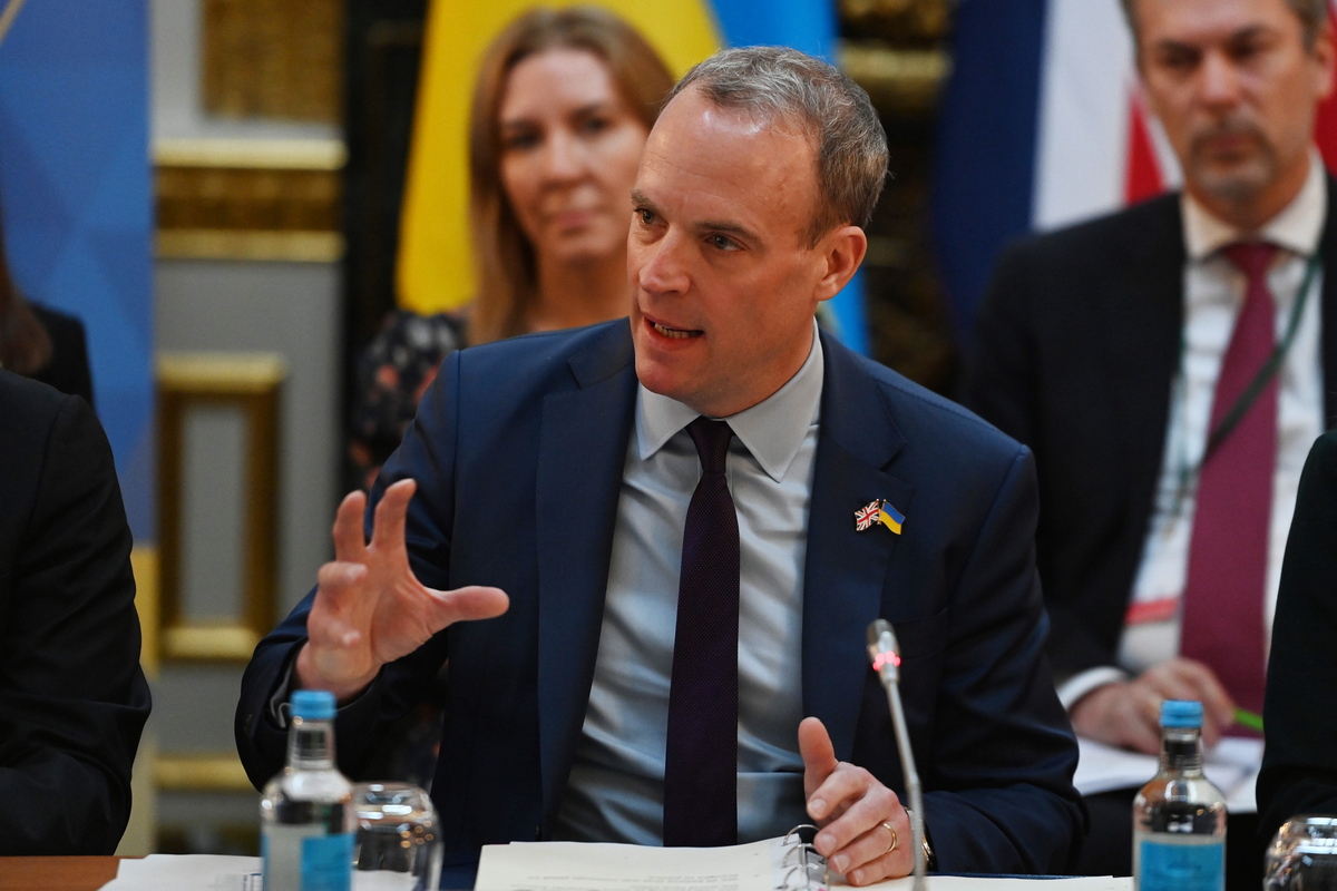 epa10533611 Britain's Deputy Prime Minister Dominic Raab delivers opening remarks during the Justice Ministers' Conference at Lancaster House in London, Britain, 20 March 2023. The event is hosted by the Ministry of Justice of the UK and the Ministry for Justice and Security of the Netherlands in support of the International Criminal Court (ICC) and the investigation into the situation in Ukraine. EPA/NEIL HALL