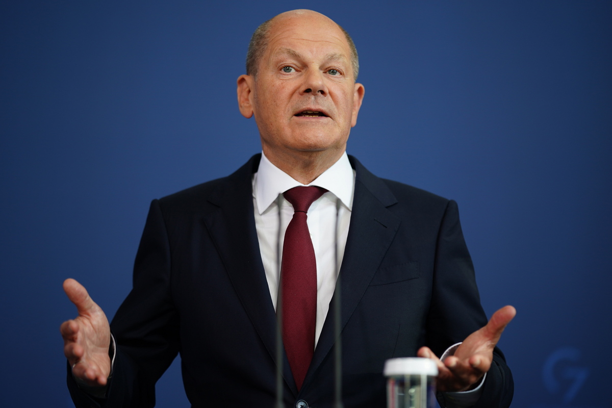 epa09936457 German Chancellor Olaf Scholz gestures during a joint press conference with French President Emmanuel Macron (not pictured) at the Chancellery in Berlin, Germany, 09 May 2022. Chancellor Scholz and President Macron met for bilateral talks. EPA/CLEMENS BILAN