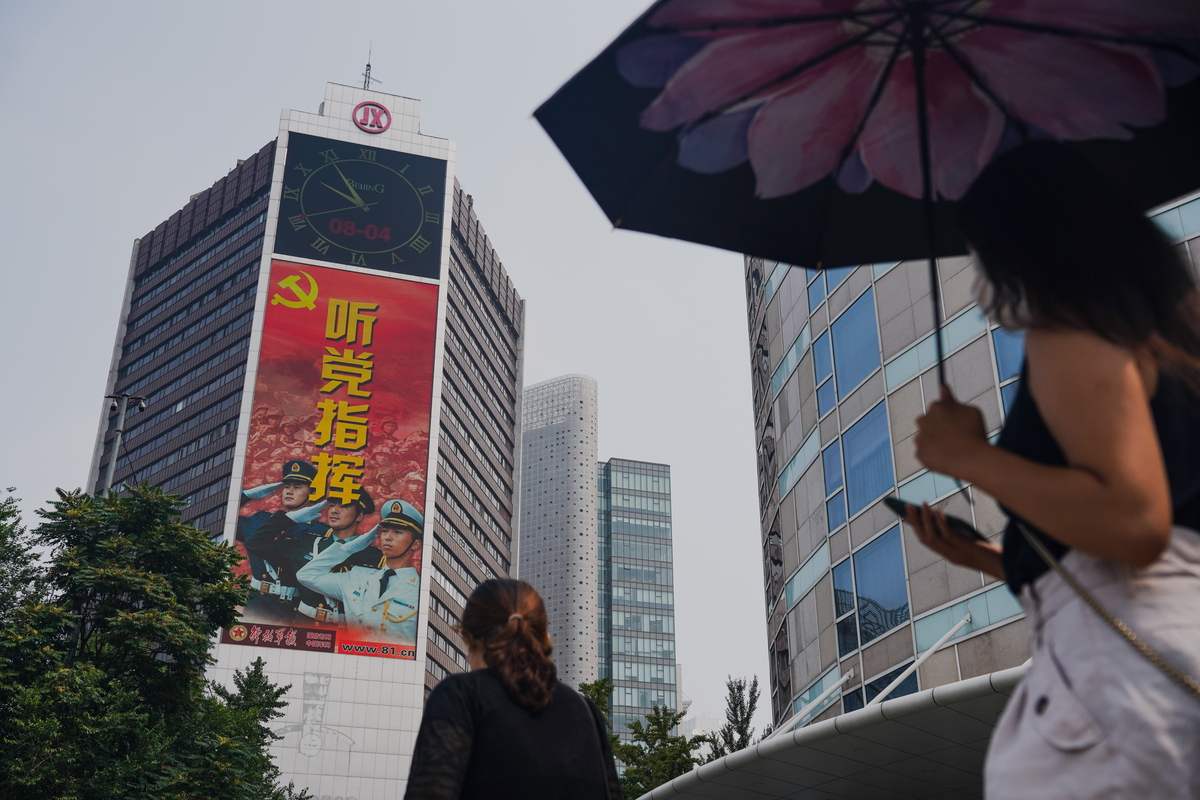 epa10105070 A military advertisement marking the 95th founding anniversary of the People's Liberation Army (PLA) is displayed at an office building in Beijing, China, 04 August 2022. China responded to the visit of US House Speaker Nancy Pelosi by announcing a series of military exercises surrounding Taiwan and trade curbs on the import of fruit and fish from the country as well as stopping shipments of sand to the island. EPA/WU HAO
