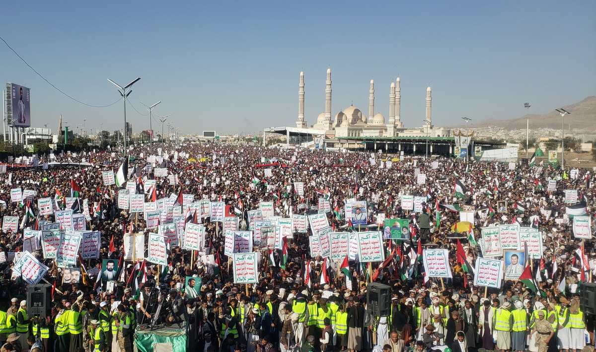 Χιλιάδες πολίτες διαμαρτύρονται στη Σαναά της Υεμένης ενάντια στην πολυεθνική στρατιωτική επιχείρηση «Prosperity Guardian» για την προστασία της ναυτιλίας στην Ερυθρά Θάλασσα, μετά τις επιθέσεις των Χούθι και τις επακόλουθες αεροπορικές επιδρομές των ΗΠΑ και του Ηνωμένου Βασιλείου, 12 Ιανουαρίου 2024. EPA/YAHYA ARHAB