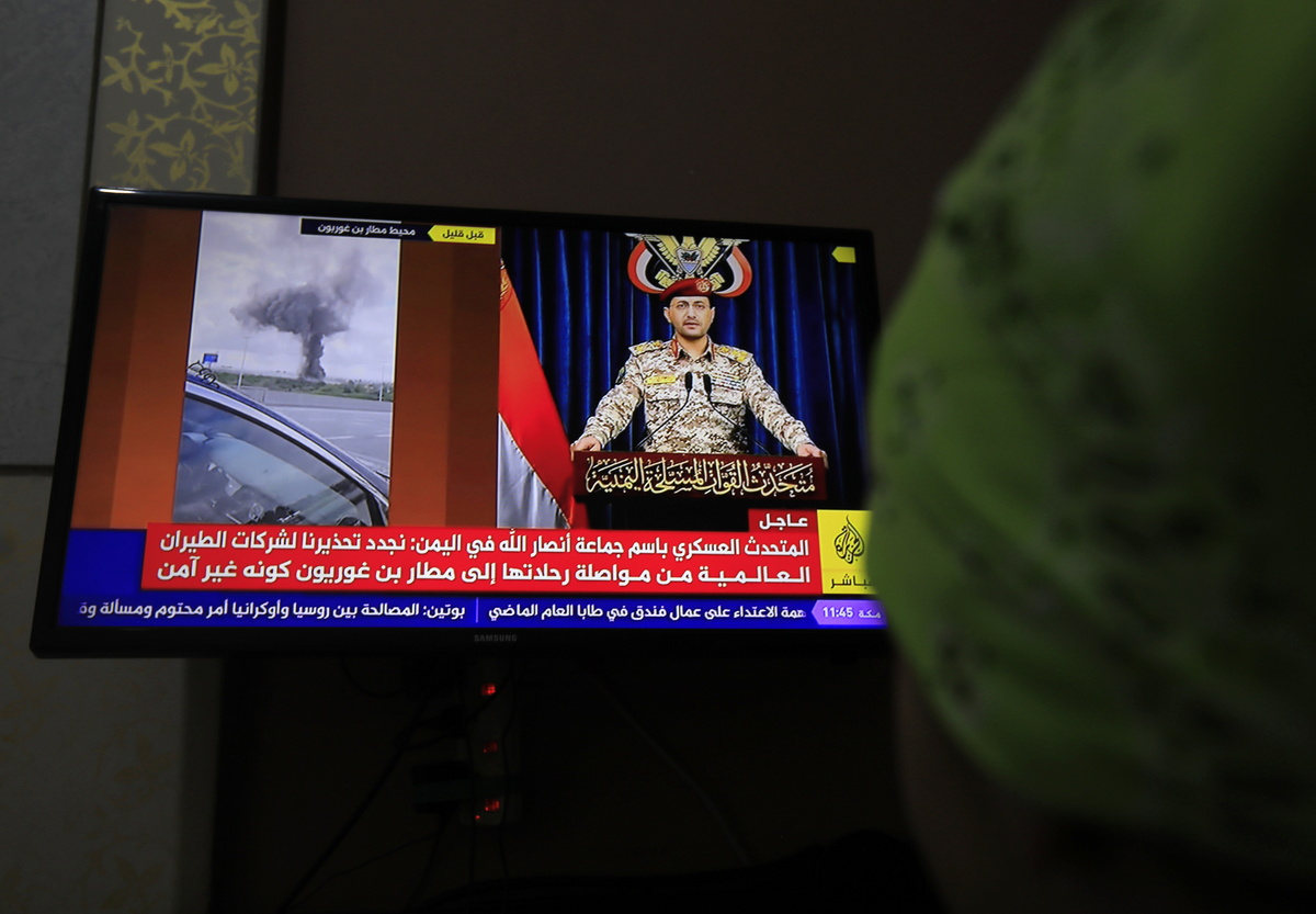 epa12072614 A person watches Houthi military spokesman Yahya Sarea delivering a televised statement about a missile attack on Israel's Ben Gurion airport, in Sana'a, Yemen, 04 May 2025. Yemen's Houthis have claimed responsibility for launching a missile at Israel's Ben Gurion airport, amid high tensions with the USA and Israel over the Israeli bombardment of the Gaza Strip, Houthi military spokesman Yahya Sarea said in a statement. EPA/YAHYA ARHAB