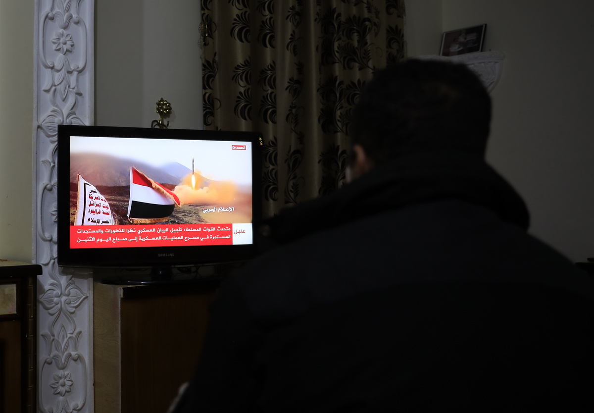 epa11165364 A person watches the news on a Houthis-run TV after a UK-registered ship came under attack in the Red Sea, in Sana'a, Yemen, 19 February 2024. A UK-registered cargo ship came under attack on 18 February in the Red Sea off the coast of Yemen, according to the UK's Maritime Trade Operations (UKMTO). The attack came just a day after the US forces launched five strikes on Houthi targets, including an unmanned underwater vessel, in Yemen. The US designation of Yemen's Houthis as a 'Specially Designated Global Terrorist group' came into effect on 16 February, due to their increased attacks on shipping lanes in the Red Sea and the Gulf of Aden since November 2023. The US Department of Defense announced in December 2023 a multinational operation to safeguard trade and protect ships in the Red Sea in response to the escalation of Houthi attacks. EPA/YAHYA ARHAB