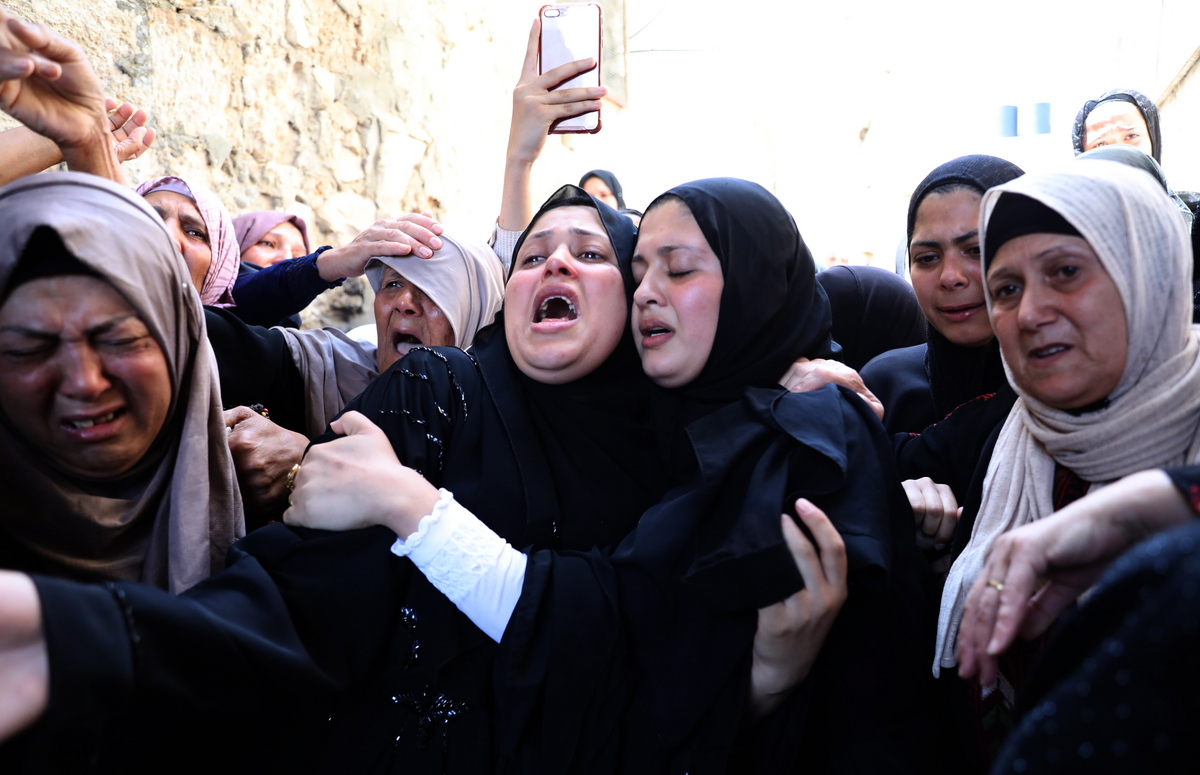 epa10017980 Palestinian relatives of Yousef Salah mourn during his funeral in the West Bank City of Jenin, 17 June 2022. The Israeli army spokesperson said the shooting occurred during a raid conducted to seize illegal weapons and Israeli soldiers responded to Palestinian fire. According to the Palestinian Ministry of Health, 14 other people were wounded during clashes that erupted following the raid. EPA/ALAA BADARNEH