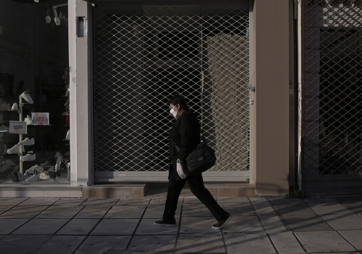 Μία γυναίκα με μάσκα προσώπου περνάει μπροστά από βιτρίνες κλειστών καταστημάτων, στη Θεσσαλονίκη, τη Δευτέρα 30 Μαρτίου 2020. Στην Ελλάδα είναι σε ισχύ το μέτρο της απαγόρευσης κυκλοφορίας με σκοπό τον περιορισμό της εξάπλωσης της πανδημίας του κορονοϊού. ΑΠΕ-ΜΠΕ/ΑΠΕ-ΜΠΕ/ΑΧΙΛΛΕΑΣ ΧΗΡΑΣ