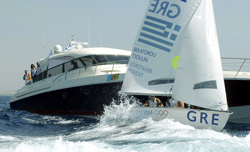 Gianna Angelopoulos, president of the organizing committee of the Olympic Games Athens 2004, watching and celebrating, inside her luxurious yacht, Greek female athletes of sailing Sophia Bekatorou and Emily Tsoulfa winning the gold medal at Olympic Games, Athens, August 2004 / Ç ÃéÜííá Áããåëïðïýëïõ, ðñüåäñïò ôçò ïñãáíùôéêÞò åðéôñïðÞò ôùí Ïëõìðéáêþí Áãþíùí ÁèÞíá 2004, ðáñáêïëïõèåß êáé ðáíçãõñßæåé ìÝóá áðü ôç èáëáìçãü ôçò, ôçí êáôÜêôçóç ôïõ ÷ñõóïý ìåôáëëßïõ áðü ôéò áèëÞôñéåò ôçò éóôéïðëïÀáò Óïößá Ìðåêáôþñïõ êáé Áéìéëßá ÔóïõëöÜ, ÁèÞíá, Áýãïõóôïò 2004