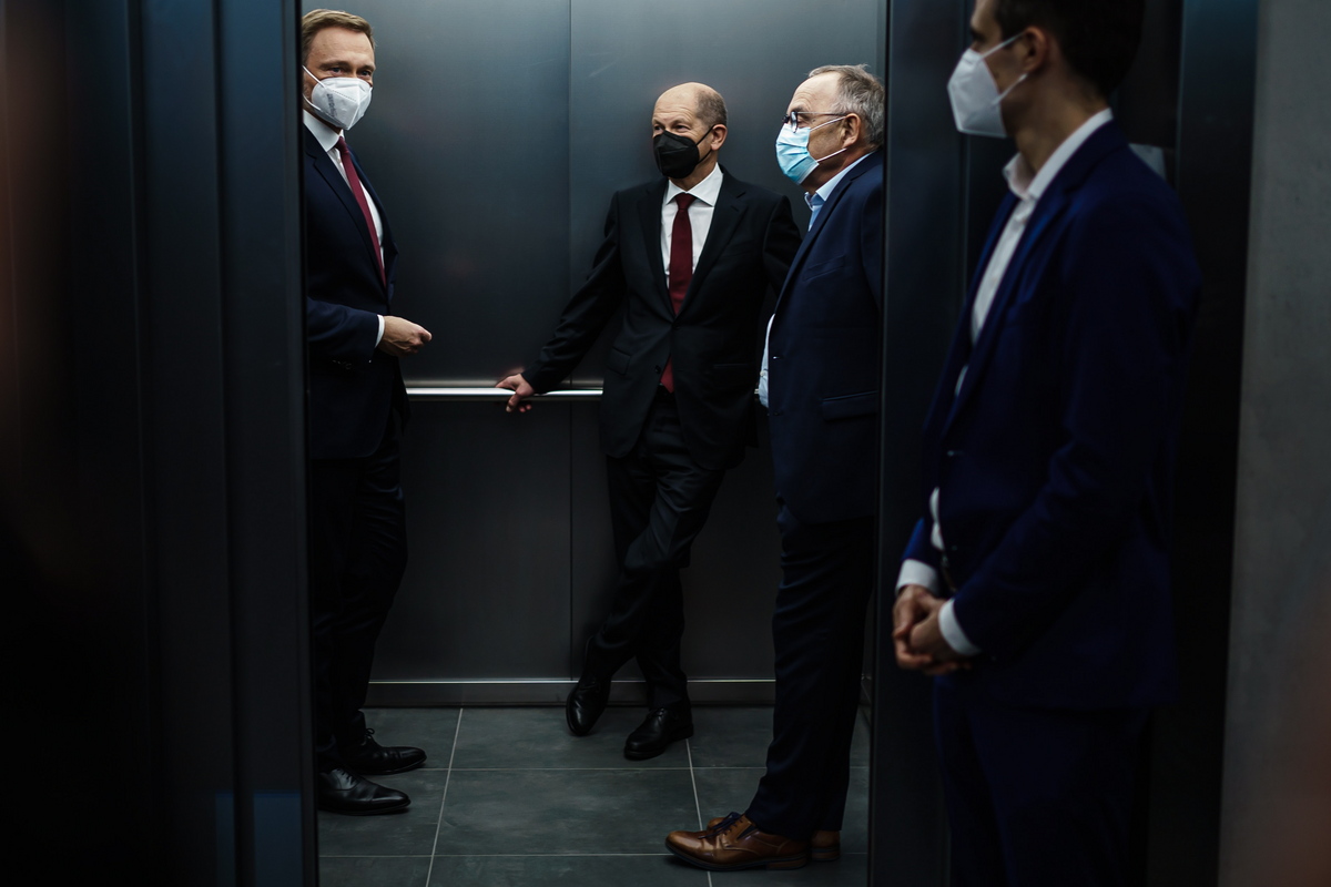 epa09525101 Free Democratic Party (FDP) chairman and faction chairman in the German parliament Bundestag Christian Lindner (L), German Minister of Finance and Social Democratic Party (SPD) top candidate for the federal elections Olaf Scholz (2-L) and Social Democratic Party (SPD) co-chairman Norbert Walter-Borjans (3-L) leave in an elevator after a statement following exploratory talks between the Free Democrats (FDP), The Greens (Die Gruenen) and the Social Democrats (SPD), in Berlin, Germany, 15 October 2021. Greens, SPD and FDP meet in search for coalition possibilities after Germany's recent parliamentary election. EPA/CLEMENS BILAN