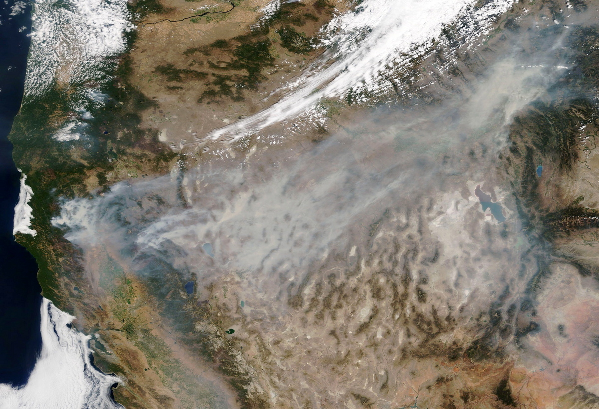 epa09407023 A handout satellite image made available by NASA's Worldview application, part of the NASA Earth Observing System Data and Information System (EOSDIS), shows the extend of smoke caused by the wildfires in Northern California across the country, 08 August 2021 (issued 09 August 2021). EPA/NASA WORLDVIEW HANDOUT HANDOUT EDITORIAL USE ONLY/NO SALES