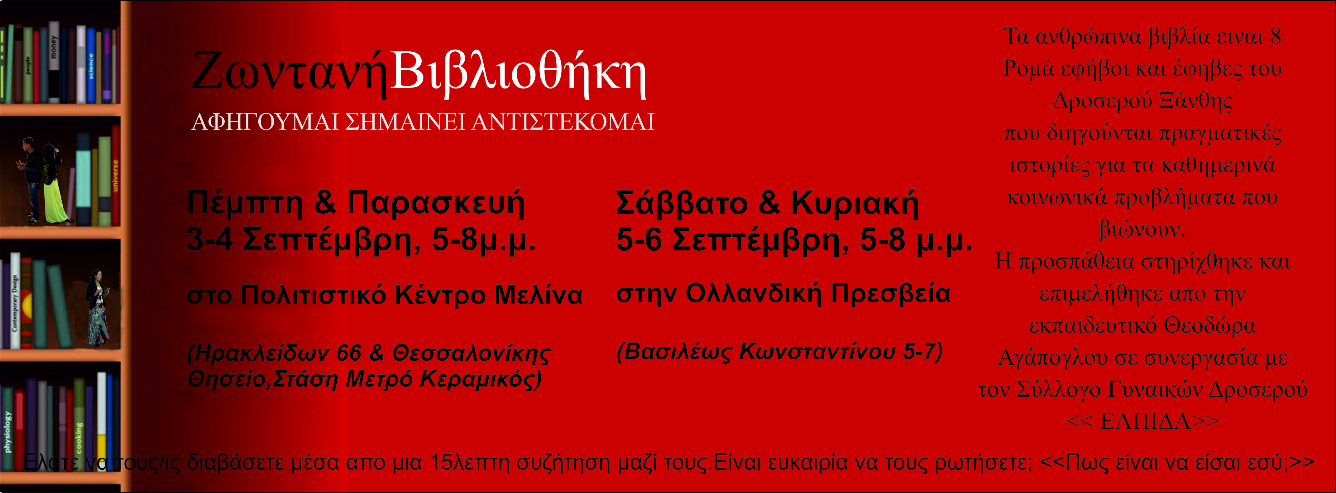 Οχτώ μαθητές του Γυμνασίου από το Δροσερό της Ξάνθης έχουν έρθει στην Αθήνα και διοργανώνουν την «Ζωντανή Βιβλιοθήκη», από τις 3 έως τις 6 Σεπτεμβρίου 2015. Τα παιδιά γίνονται βιβλία και τολμούν να βγουν από την πόλη τους και να ταξιδέψουν στην Αθήνα για να ακουστούν, να μιλήσουν για τη ζωή τους αλλά και να γνωρίσουν Αθηναίους που δύσκολα θα επισκεφθούν το Δροσερό, έναν οικισμό μουσουλμάνων ρομά της Θράκης.
