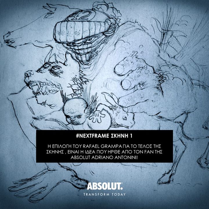 Η «Σκηνή 1» , που παρουσιάστηκε στο κοινό της ABSOLUT την Δευτέρα (3/2), δείχνει τον Vincent Black, τον πρωταγωνιστή-ήρωα του #NextFrame, να τρέχει πανικόβλητος προσπαθώντας να αποφύγει κάτι. Στο τέλος της σκηνής ζητείται από τους fans της σελίδας να μοιραστούν τις ιδέες τους, μέσα σε συγκεκριμένο χρονικό διάστημα, για το πώς φαντάζονται το πλάσμα που κυνηγά τον Vincent! Οι ιδέες των fans, συλλέχθηκαν από την ABSOLUT, εστάλησαν στον Rafael και εκείνος με τη σειρά του, διάλεξε την ιδέα του FB χρήστη Adriano Antonini , για να αποτυπώσει τη μορφή αυτού του πλάσματος. Η ιδέα του Adriano περιέγραφε ένα πλάσμα σε οργανική μορφή, πάνω στο οποίο γεννιούνται και μεγαλώνουν όλες οι ιδέες του “κόσμου των ιδεών”.