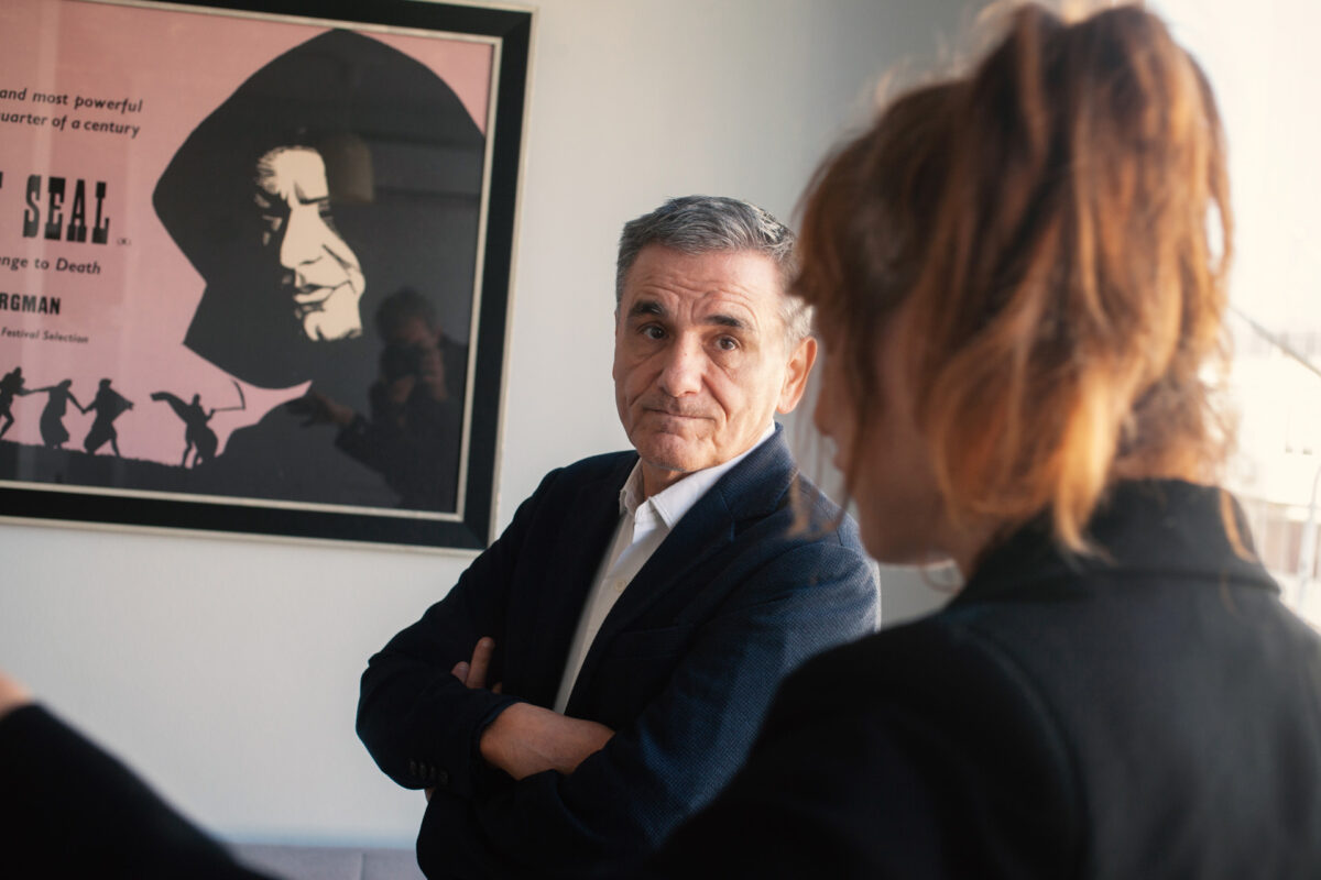 Έχει ανασφάλεια με τα ελληνικά του, την ακρίβεια των διατυπώσεών του, αλλά κυρίως είναι, διαπιστώνω, φρικτά επιφυλακτικός με τον Τύπο, μετά από τίτλο συνέντευξής του σε ιστορική εφημερίδα, που τον εξέθετε και κόντεψε να προκαλέσει κρίση στη σχέση του με τον Αλέξη Τσίπρα. Το πάθημα-μάθημα, το επαναλαμβάνει αρκετές φορές. Προσπαθώ να σπάσει ο πάγος στο γραφείο του, έχοντας στην πλάτη μας απειλητικό τον Χάρο, από την ανεξίτηλη «Έβδομη Σφραγίδα» του Ίνγκμαρ Μπέργκμαν.