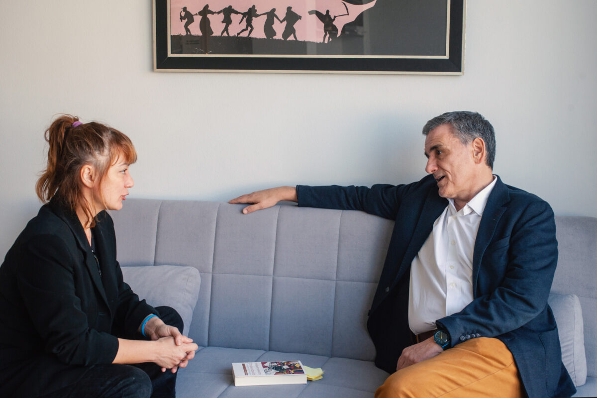 Ο Ευκλείδης Τσακαλώτος με την Ιωάννα Κλεφτόγιαννη στο γραφείο του κατά τη διάρκεια της φωτογράφισης.