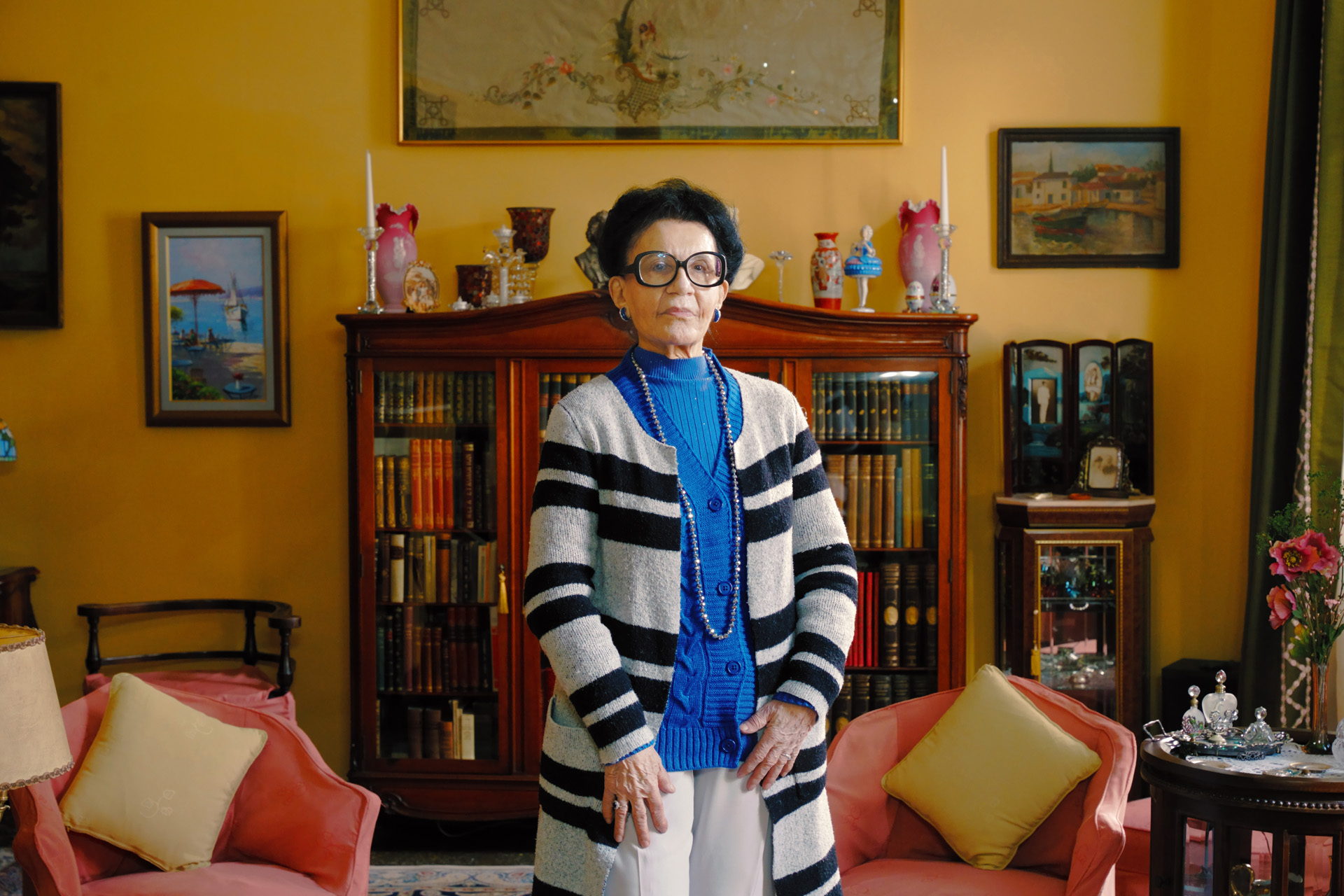 Ενώ συζητάμε, η Λένα Γιγάντε μάς ξεναγεί στο σπίτι. Ξεφυλλίζουμε παλιά και σπάνια βιβλία του παππού της. Στο ένα υπνοδωμάτιο, στεκόμαστε με δέος μπροστά στις πρώτες έγχρωμες φωτογραφίες. «Δεν μπορείς να τις δεις αν δεν έχουν φως από πίσω», λέει πατώντας τον διακόπτη. Στη μία, μαζί με μέλη της οικογένειάς της, απεικονίζεται ο θρυλικός φαρμακοποιός των Αθηνών Πέτρος Μπακάκος, με τη γυναίκα του Μινέρβα – «Ήταν κολλητοί του παππού». Παραδίπλα, δύο φωτογραφίες της μητέρας της και της θείας της, Αύρας, τραβηγμένες από την πολυθρύλητη πρώτη γυναίκα φωτογράφο της Ελλάδας, Νέλλη – κάτω δεξιά, η υπογραφή της.