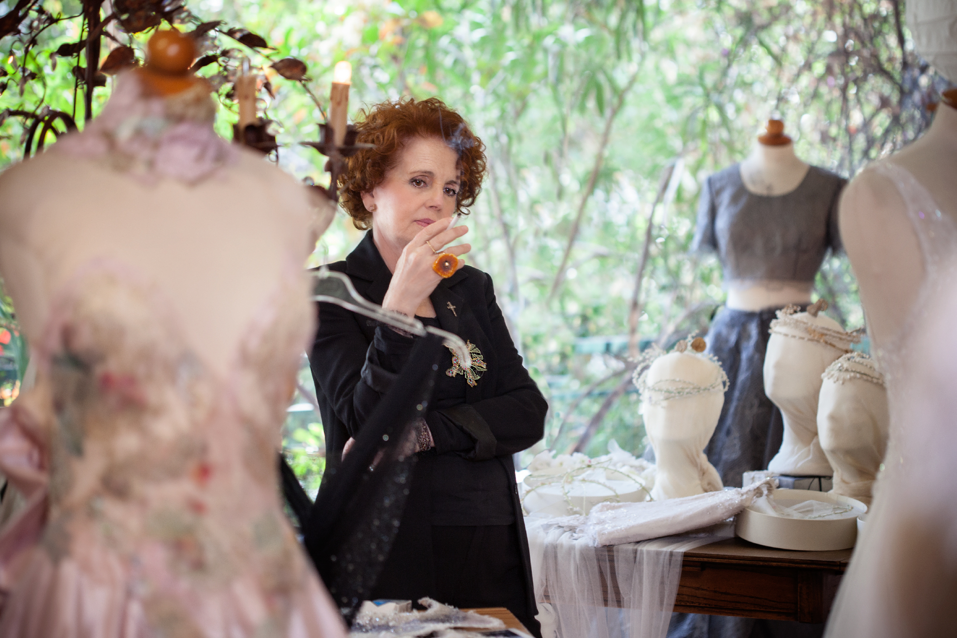 Λίγο πριν συμβεί αυτό, όμως, μας υποδέχεται στο ατελιέ της για να μιλήσει με διάθεση και όρεξη για τη δουλειά της και την τέχνη. Το μόνο που την αγχώνει είναι η φωτογράφιση καθώς δηλώνει άνθρωπος του παρασκηνίου. Χαλαρώνει μόνο όταν μαθαίνει ότι μπορεί να φωτογραφηθεί καπνίζοντας. «Κάνω περίπου 10 τσιγάρα τη μέρα. Βρίσκετε ότι είναι πολλά;» ρωτά ενώ στήνεται μπροστά στον φακό και ζητά από τον φωτογράφο Νίκο Βαρδακαστάνη να μη τη βγάλει λυπημένη.