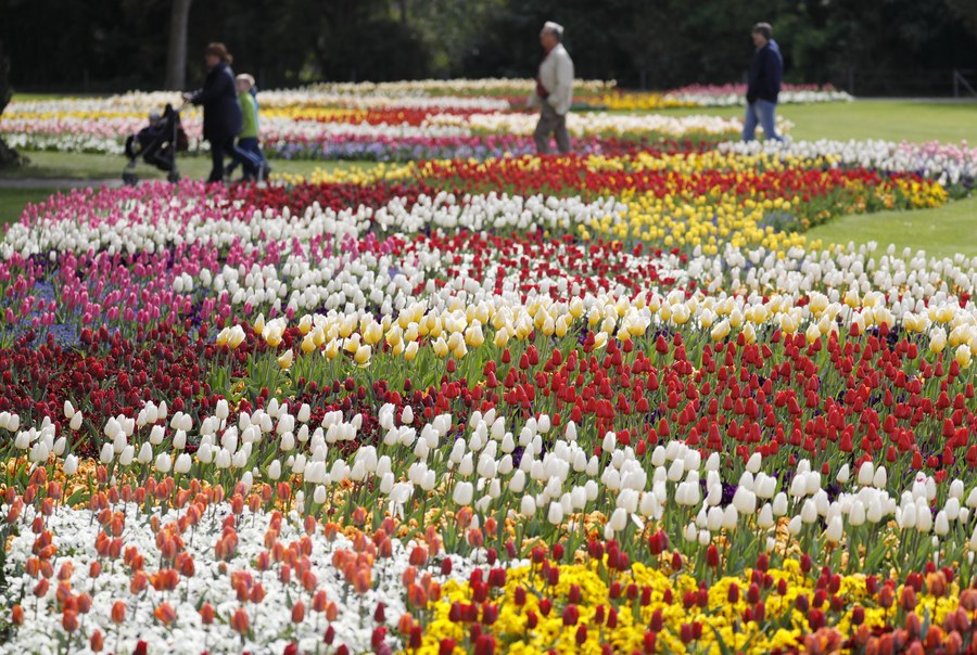epa05902991 Visitors stroll through a field of flowering Tulips at the Wilhelma Zoo in Stuttgart, Germany, 11 April 2017. According to weather forecasts, it is expected that the upcoming days will bring temperatures around to 18 degrees Celsius and a mix with clouds and sun in the South-West of the country. EPA/RONALD WITTEK