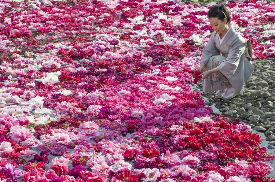 epa05950639 A woman looks at parts of over 20,000 peony blossoms on display at a traditional Japanese garden in Matsue city, Shimane prefecture, Japan, 06 May 2017 (issued 08 May). The city of Matsue is the world's largest producer of peonies. The blossoms are displayed at the gardens every year during the Japan's Golden Week holidays at the end of April and early May. EPA/EVERETT KENNEDY BROWN