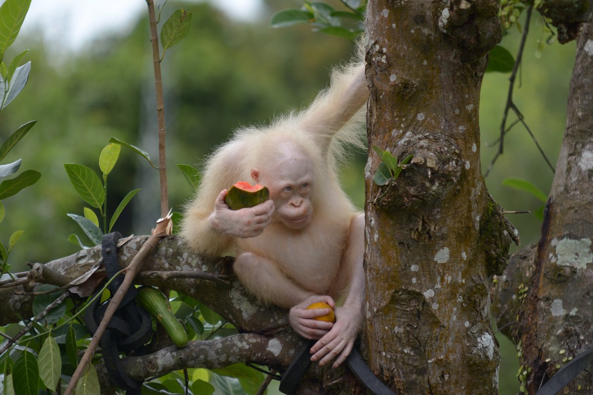 epa06214980 An undated handout photo made available by Borneo Orangutan Survival (BOS) Foundation on 20 September 2017 shows Alba, a five year old albino orangutan, hanging on a tree at Nyaru Menteng Orangutan Rehabilitation Center in Central Kalimantan, Indonesia. BOS plans to prepare a forest island for Alba and three other orangutans. The island will be minimum of five hectares where she can live freely in their natural habitat, protected from threats posed by humans, the conservation organitation said on a statement on 20 September. EPA/BOS FOUNDATION / HANDOUT HANDOUT, EDITORIAL USE ONLY, NO SALES HANDOUT EDITORIAL USE ONLY/NO SALES