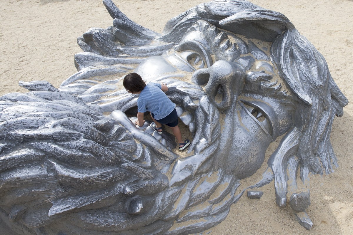 epaselect epa06136620 A child plays in the mouth of the statue entitled 'Awakening', which is a 72-foot statue of a giant rising out of the ground, on a mild summer day at National Harbor, Maryland, USA, 10 August 2017. People in the Washington DC area have been experiencing unseasonably cooler weather the last few days with highs just above 80 degrees Fahrenheit (26 Celsius), but the forecast for this coming weekend is increased humidity and showers. EPA/MICHAEL REYNOLDS