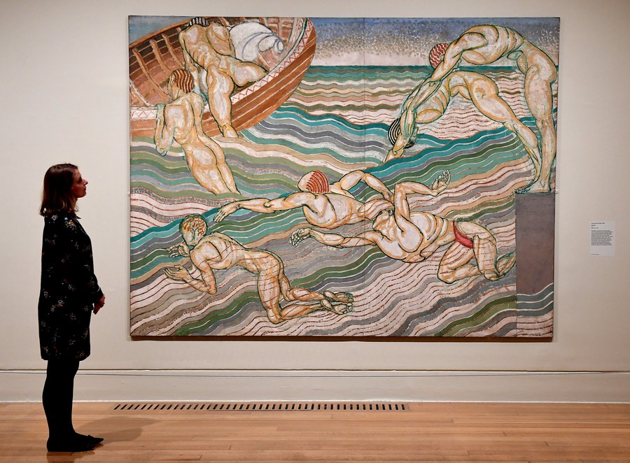 epa05885737 A Tate Britain staff looks over a painting by Duncan Grant titled 'Bathing' (1911) during Tate Britain's 'Queer British Art' exhibit at the Tate Britain in London, Britain, 03 April 2017. Tate Britain is opening its first exhibition dedicated to queer British art unveiling material that relates to gay, lesbian, bisexual, trans and queer identities. The show marks fifty years partial decriminalisation of male homosexuality in England and Wales. EPA/ANDY RAIN