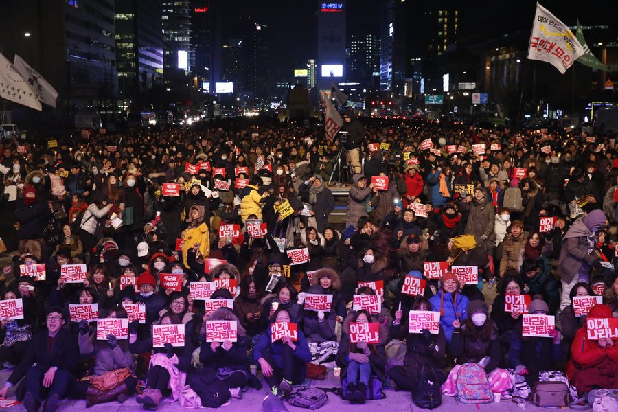 epa05647110 South Koreans shout slogans as they carry placards reading 'Park Geun-Hye Out' during a rally against South Korean President Park Geun-Hye on a main street in Seoul, South Korea, 25 November 2016. Protesters gathered to demand President Park's resignation after she has issued a rare public apology after acknowledging close ties to Choi Sun-sil, who is in the center of a corruption scandal. EPA/JEON HEON-KYUN