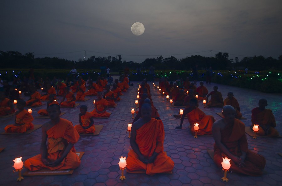 epaselect epa05952816 A group of Nepalese and Thai Buddhist monks attend the evening prayer at Mayadevi temple, to mark Buddha's birthday in Lumbini, Nepal, 09 May 2017. Thousand of Buddhist monks from various countries and pilgrims arrived in Lumbini to celebrate the 2561st birthday of Buddha at his birthplace in Lumbini. EPA/NARENDRA SHRESTHA